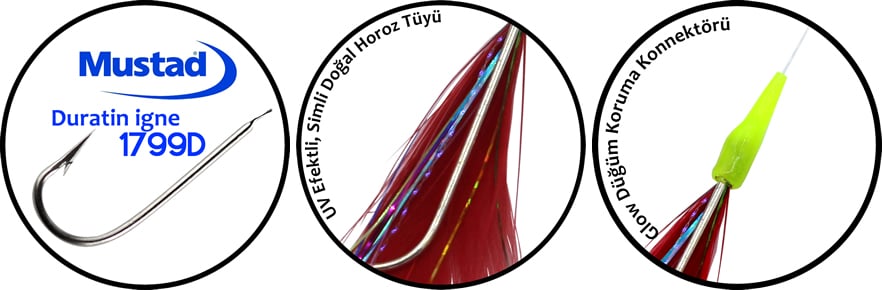 Horoz Tüyü Çapari Kösteklerin Avcılığı : Çapari kösteğimiz UV boya teknolojisine sahip horoz tüyü ve sim kombinasyonu ile elde üretilmektedir. Gündüz ve gece tekne'den palamut, uskumru gibi balıkların avına özel üretilmiştir.