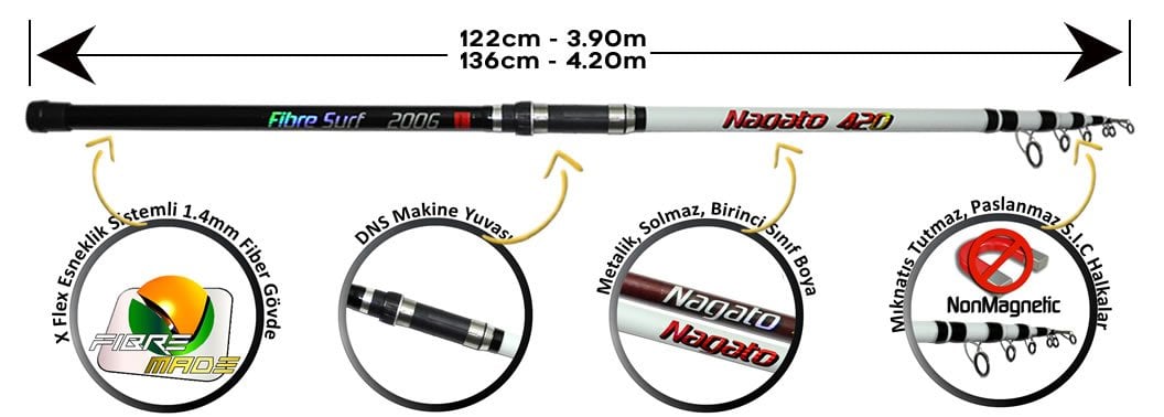 Michigan Nagato Surf Kamış serisi, Türkiye suları ve Surf tekniğini tercih eden yerli balıkçılarımızın kullanım kriterleri gözetilerek, Mükemmel atış performansı ve sert yapısına rağmen kamış'a son derece esneklik sağlayan X-Flex sistemi ile entegre edilmiş ham fiber elyaf materyal, S.I.C. Epoxi sargılı Non magnetic, Paslanmaz halkalar, DNS makine yuvası gibi detaylar ile donatıldı.