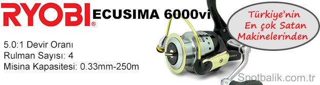 2)Riyobi Ecusima 6000vi Olta Makinesi : 5.0:1 devir oranlı, 0.33mm/250m misina sarım kapasiteli, 4 bilyalı(rulmanlı), önden kalama ayarlı, 60'lik metal makaraya sahip, 8kg drag gücü, sağ yada sol ele göre değiştirilebilir metal kola sahip bir olta makinesidir. Hem tuzlu hem de tatlı su avlarına uygun, orta boy makaraya sahip bir olta makinesidir.