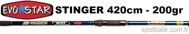 1 )EvoStar Stinger 420cm 200gr Surf Olta Kamışı : 420cm uzunluğunda, karbon malzemeli, 200gr atarlı(aksiyonlu), 4 parçalı, 5 porselen halkalı, 438gr ağırlığında, kapalı uzunluğu 116cm'dir. Hem tuzlu hem de tatlı suda balık avına uygundur.