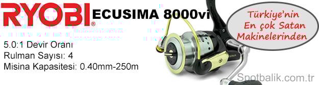 2)Ryobi Ecusima 8000vi Olta Makinesi : 5.0:1 devir oranlı, 0.40mm/250m misina sarım kapasiteli, 4 bilyalı(rulmanlı), önden kalama ayarlı, 80'lik metal makaraya sahip, 8kg drag gücü, sağ yada sol ele göre değiştirilebilir metal kola sahip bir olta makinesidir. Hem tuzlu hem de tatlı su avlarına uygun, orta boy makaraya sahip bir olta makinesidir.